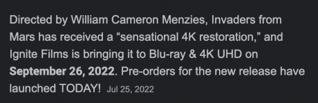 Ignite’s beautifully fine-tuned 4K Invaders From Mars Bluray was supposed to be released last September, but it’s apparently still sitting at a Sony DADC warehouse in Stenovice, Czech Republic**.