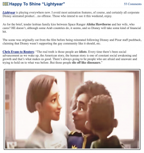 It was suggested last June that the under-performing of Disney’s Lightyear may have been at least partly due to parental pushback again a no-big-deal lesbian kiss scene. It is suspected that parents in flyover regions are generally squeamish about Disney animated features feeding liberal, comme ci comme ca, “whatever floats your boat” propaganda to family audiences.