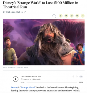Variety‘s Rebecca Rubin is reporting that Disney’s Strange World, an animated, family-friendly feature that opened on 11.23, is expected to lose $100 million in its theatrical run — a total wipeout.