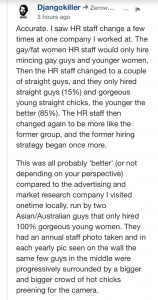 So I’m deleting the bogus photo, which seemed to indicate or represent a lack of diverse hiring practices at a certain company, and substituting some of the comments in its place.