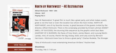 Also not to be trusted is a website claim by Seattle’s Grand Illusion theatre, stating that a “new 4K restoration” was screened a year ago (2.3.22). The same insider informs that WHE’s DCP of North by Northwest is 4K, but if the Grand Illusion presentation really was a true 4K finish (as the web page implies), it would not be of sufficient quality for a 4K UHD release.