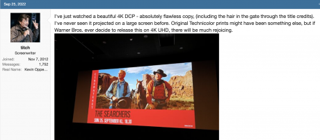 And yet Oppegard, I’ve been told, is apparently full of shit. A guy who’s reliably in the know informs that Warner Home Entertainment’s DCP of The Searchers is only 2K, and represents the work done 16 years ago.