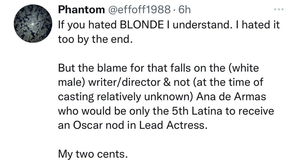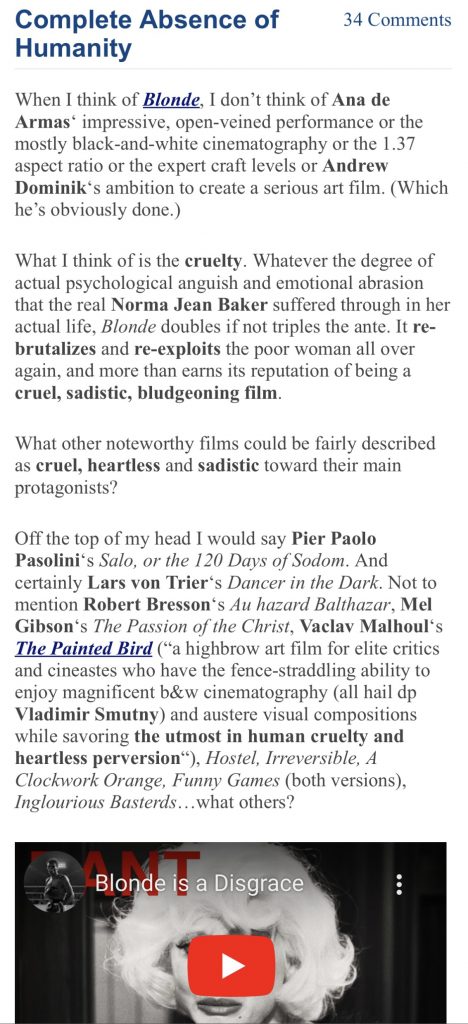 I’m also scratching my head about the seemingly scripted Andrea Riseborough Best Actress campaign for her performance in To Leslie. Her performance as an all-but-hopeless drunk who takes forever to hit bottom is…well, the first term that comes to mind is “whew!” Yes, she’s raw, real, scalding — you can’t help but say “wow, Andrea really went for it…I mean, she doesn’t care if the audience likes her character or not.”