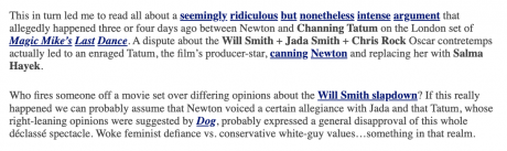 I loved Crouching Tiger and all, but it’s no secret there are more ardent fans of martial-arts movies than myself. I like aerial chop-socky the way I like musical numbers in a ’50s Arthur Freed musical — visually exciting and beautifully performed, etc., but if there’s too much exposure to restricted worlds of this sort you can start to go a bit nuts. Sublime choreography, Chinese mythology, inspired cutting…I get it but alright already.