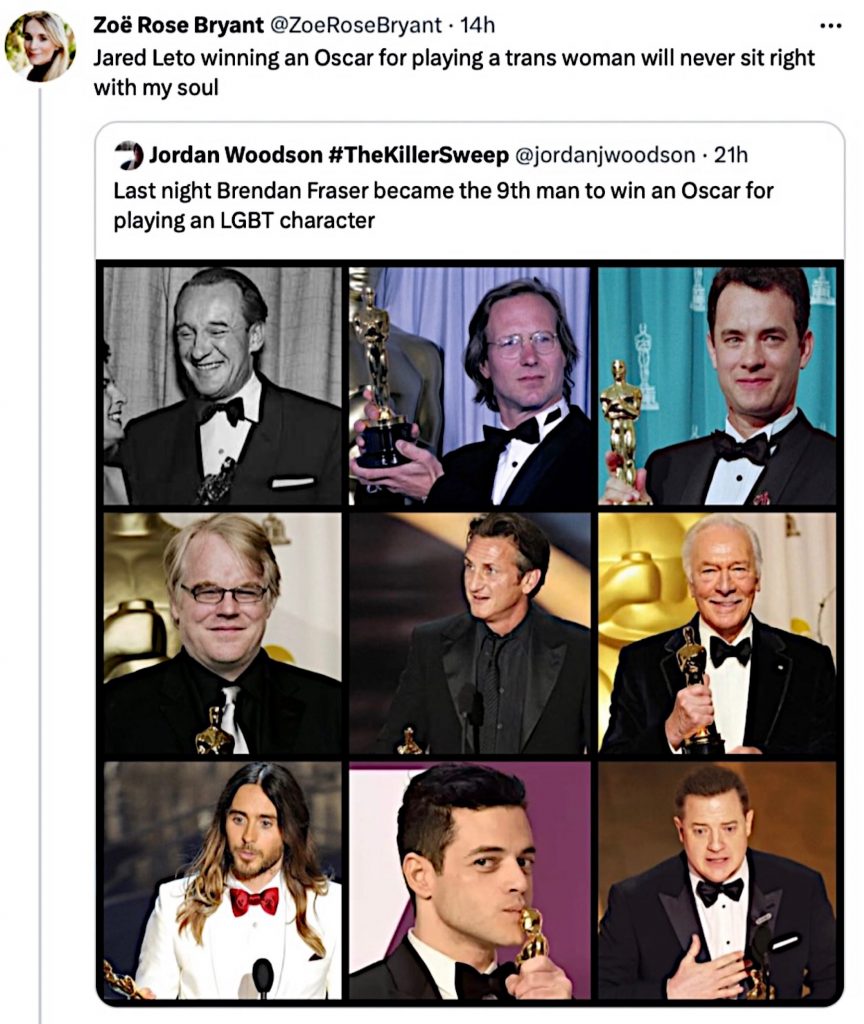 All Quiet on the Western Front and The Whale aside, it’s not just the quality of the winners but the quality of the Academy voters. No wise perspective or aesthetic backbone to speak of, carried aloft by waves of social-media whimsy, etc.