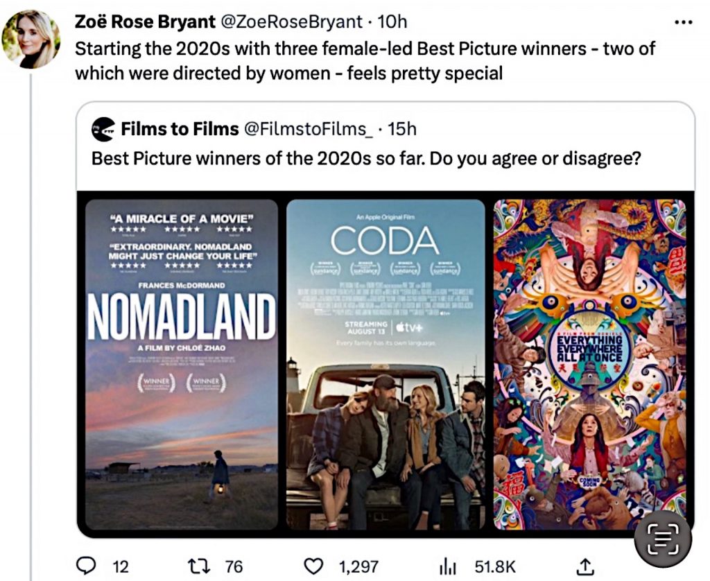 …and in its place a new religion, a Maoist DEI sociology cult that isn’t especially interested in the art and transcendence of movies as much as the social function of them…a serious lack of interest in movies that try to effectively tell human stories that connect on some primal level…movies that reach out to average viewers and establish bonds of recognition by making basic sense and cohering and elevating and translating into experiences that matter on some fundamental level.