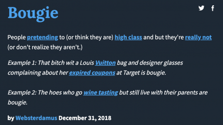 Until this morning I had somehow never heard, and had certainly never used, the slang term “bougie.” Short for bourgeois, it means people with elite or pretentious airs who haven’t earned the cred. The Urban Dictionary examples suggests it’s primarily a Black culture term, but it’s okay for guys like me to use it. A white female friend used it this morning.