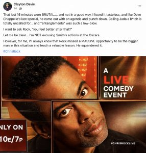 I strongly disagree with Clayton Davis’s Facebook remarks. The Variety columnist found Rock’s set “tasteless,” and said that “calling Jada a bitch is totally uncalled for.” Oh, it was called for, all right!