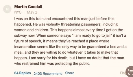 But choking a guy to death is Eric Garner territory…it’s in the general vicinity of George Floyd …it’s almost (but not quite) Bernard Goetz territory. And that’s why Monday’s choke-killing of Neely by a 24-year-old ex-Marine has become a big thing and will probably blow up ever further. Restraint, not suffocation.