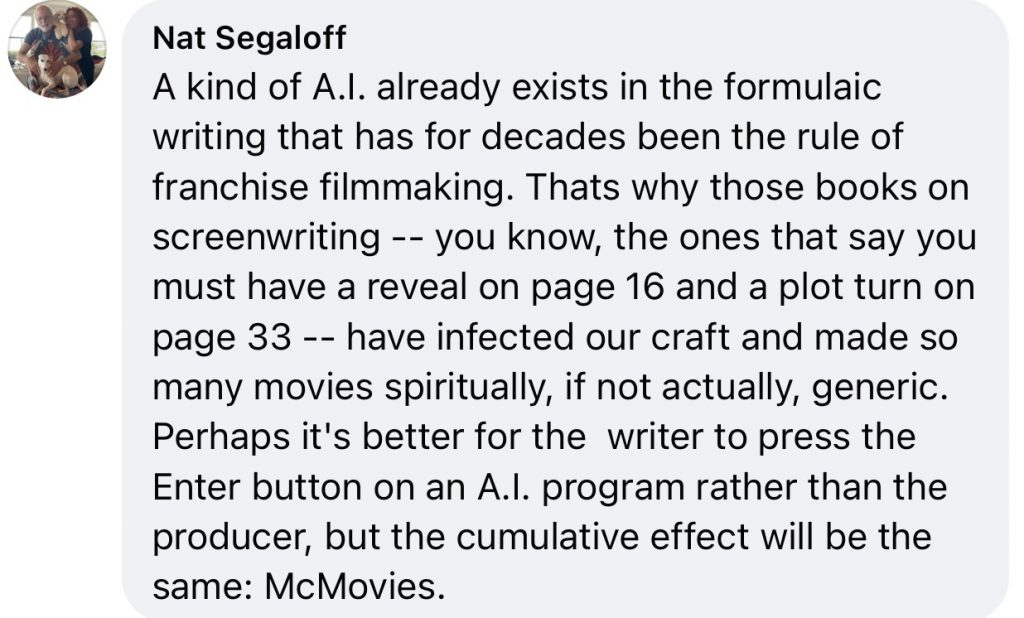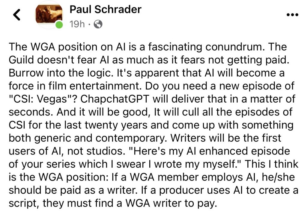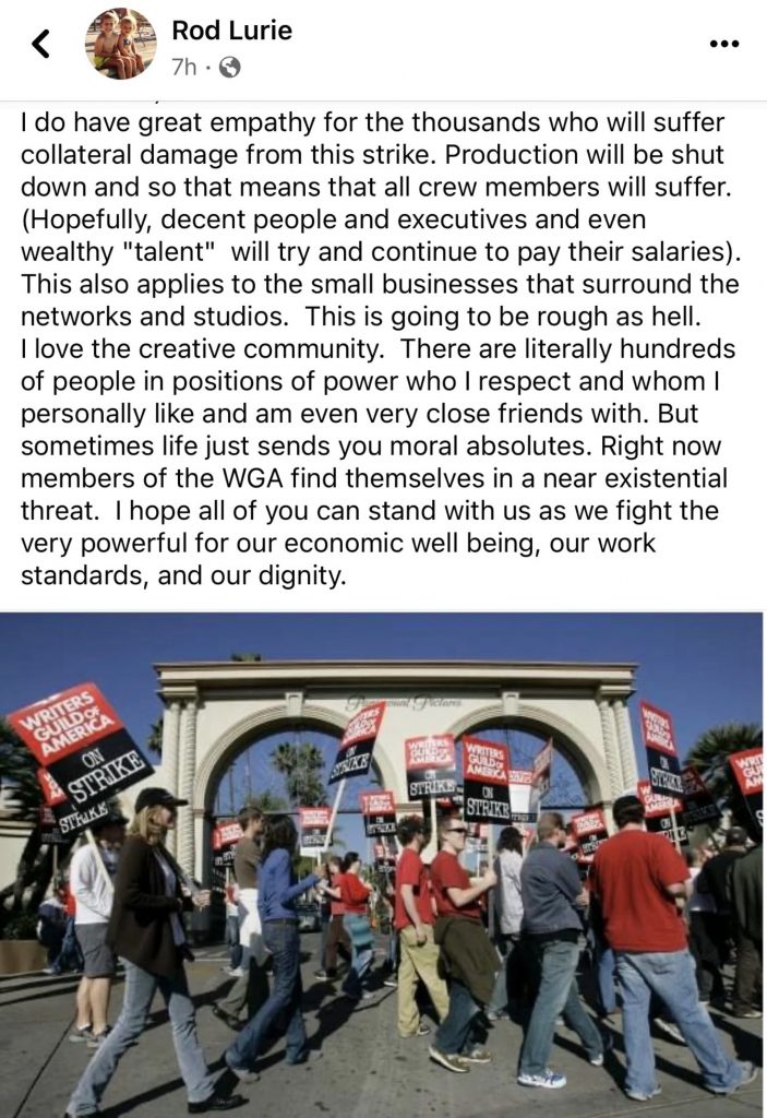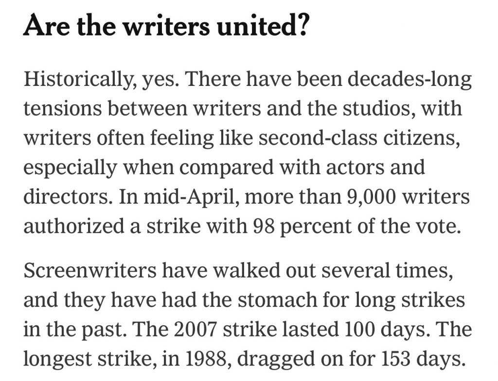 …except in the matter of WGA strikes. A feeling in my bones tells me the just-begun work stoppage, which right now is only affecting the late-night talk shows, could last well into the summer. Or beyond that, God forbid. I read this morning that the dispute boils down to 2%ofstudioprofitmargins. But the real bugaboo is the generative AI factor.