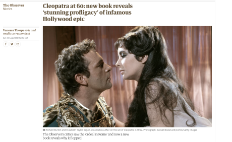 And yet the Guardian‘s Vanessa Thorpe has posted an article about it and the film itself. Thorpe’s piece is titled “Cleopatra at 60: new book reveals ‘stunning profligacy’ of infamous Hollywood epic.”