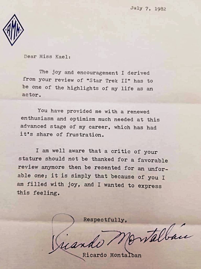 “[Ricardo] Montalban’s performance doesn’t show a trace of Fantasy Island. It’s all panache; if he isn’t wearing feathers in his hair you see them there anyway. You know how you always want to laugh at the flourishes that punctuate the end of a flamenco dance, and the dancers don’t let you? Montalban does. His bravado is grandly comic.” — Star Trek II: The Wrath of Khan, 1982