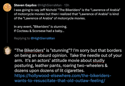I’m hugely grateful that elite cinema havens (Metrograph, Film Forum, Jacob Burns in Pleasantville, New Plaza, Elinor Bunin Monroe, Netflix Plaza, BAM, Alamo, Angelika) are part of our NYC-area culture, and that elevated film festivals (NYFF, Tribeca, Montclair, Woodstock) are still going concerns. But over the last 15 years or so the moronic masses have made their position clear.