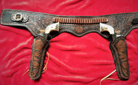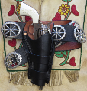 I strapped on a serious western leather rig on a movie set back in the late ’70s or early ’80s (I forget the details) and I’ve never forgotten the glorious manly feeling…the smell of well-oiled leather, the weight of those iron guns, those thigh straps, those bullets tucked into the bullet holders…all of it.