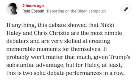 I liked Nikki Haley (fast on her feet, razor-sharp comebacks) and Chris Christie (stood his ground, told it straight) in Wednesday night’s Republican debate -— definitely my top two.