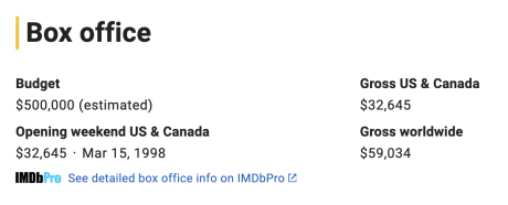 In fact, both IMDB Pro and thenumbers.com report that Mean Streets grossed $32,645 domestic (U.S. and Canada) and somewhere in the vicinity of $59,034 worldwide. The Numbers actually reports that the global take was $50,539.
