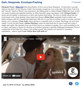 The kids are always model-pretty and instinctually promiscuous in any Larry Clark film, but in my experience people of any age who live in bumblefuck towns like Marfa, which has been losing population and revenue sources since the ’90s, tend to be on the pudgy, plain, unattractive side. Then again the fact that Marfa has a thriving art community might allow for an exception. Shot in 2012, Marfa Girl was directly exhibited on Clark’s website until Spotlight picked up rights. Costarring Adam Mediano, Drake Burnette, Jeremy St. James, Mercedes Maxwell. 3.27 in theatres, 4.3 on iTunes/VOD.