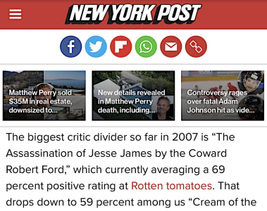 Last night I began to re-watch Andrew Dominik‘s The Assassination of Jesse James by The Coward Robert Ford — the first rewatch in the nearly 16 years since it opened. Then I decided it was too late (after 11 pm) so I’ll give it a shot tonight.