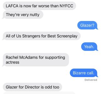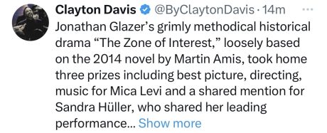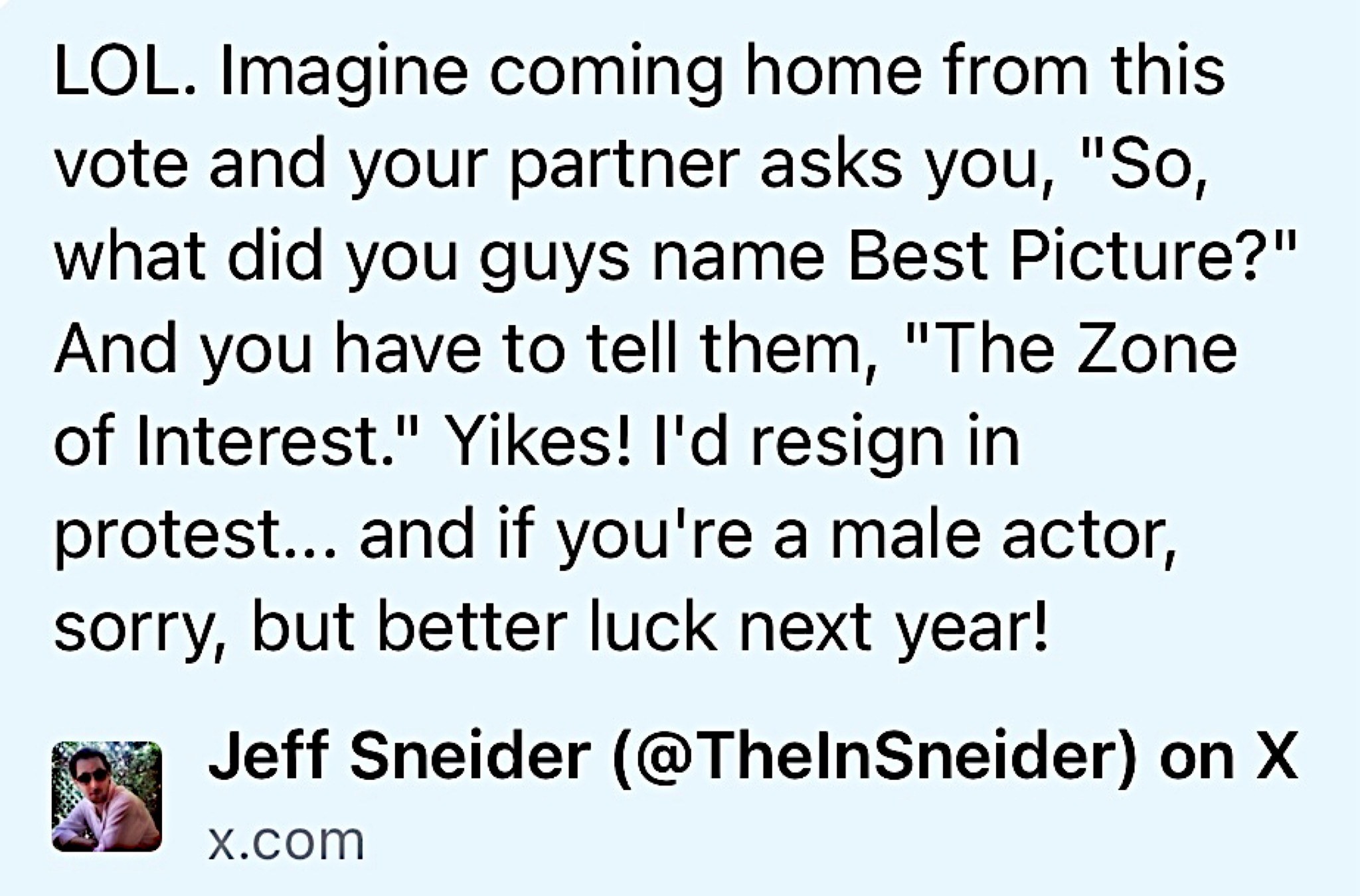 It seems to HE that LAFCA giving its top two trophies — Best Picture and Director — to The Zone of Interest and director-screenplay adapter Jonathan Glazer — was primarily a political-cultural gesture of support for Israel in its current Gaza conflict against Hamas.
