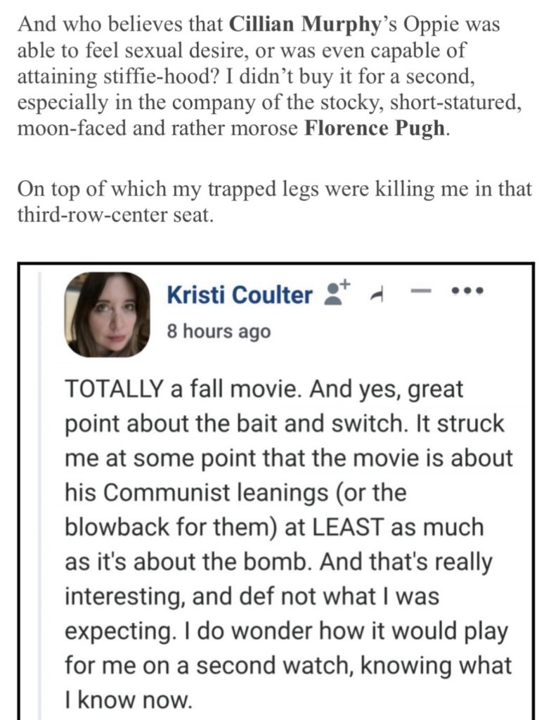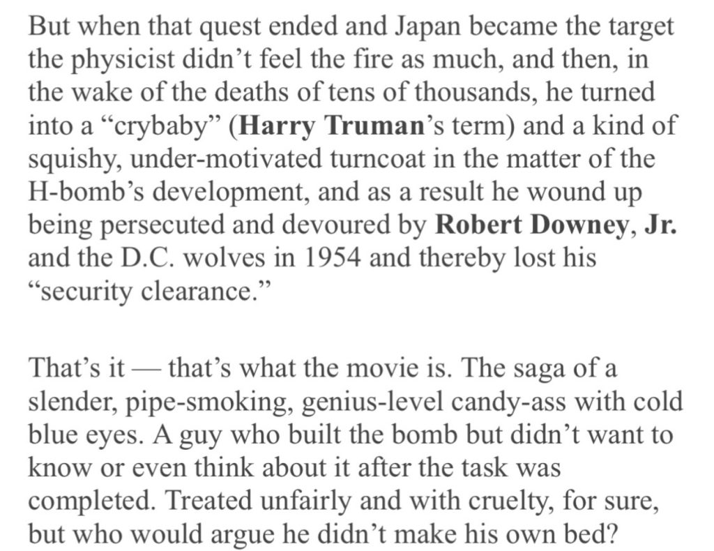 The Holdovers, Maestro and Poor Things, alas, were ceremoniously uncoupled from the main deck and allowed to fall into the sea — victims of an actual war and passed over for the same reason that Zone benefitted — Zone had the important symbolic echo factor and the other three didn’t.