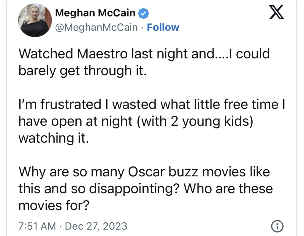 She is, however, echoing the views of younger none-too-brights who don’t know much about Leonard Bernstein and who resent biopics that don’t adhere to the standard approach. And this suggests that your SAG-AFTRA dummies may be voting for more conventional fare.