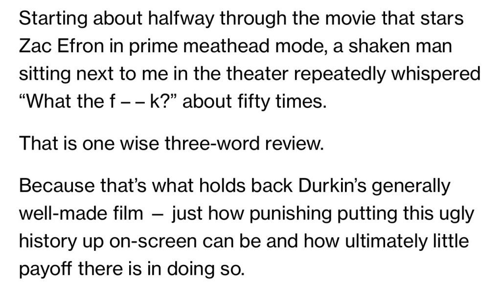 It took me less than ten minutes to decide I didn’t give a damn about the Von Erichfamily and their ludicrous blue-collar braggadocio and strange penchant for self-destruction and tragedy — Kevin (Efron), Kerry (Jeremy Allen White), David (Harris Dickinson), Papa Fritz (Holt McCallany), Mama Doris (Maura Tierney), Pam Adkisson (Lily James) and Mike (Stanley Simons).