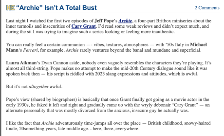 A month ago I briefly reviewedJeff Pope‘s Archie, a four-part Britbox miniseries about the emotionally and psychologically fraught Cary Grant. I didn’t like it much, but after watching the final two episodes I was struck by a curious observation.
