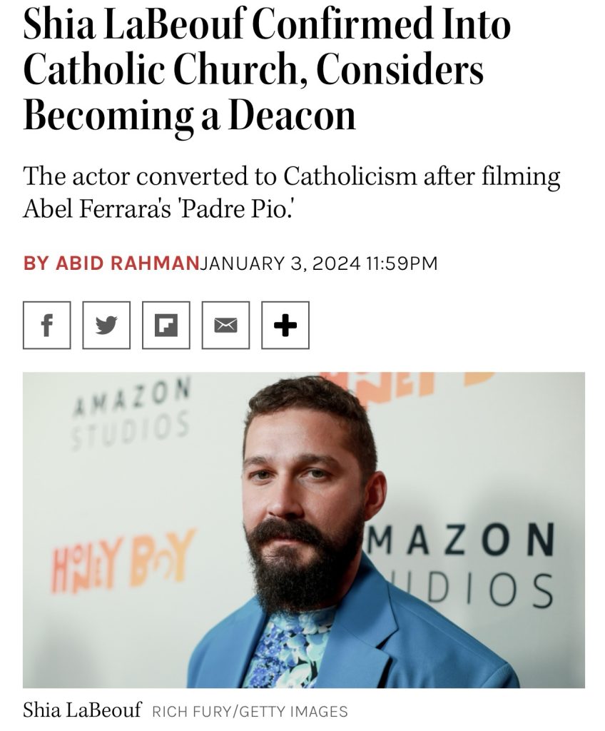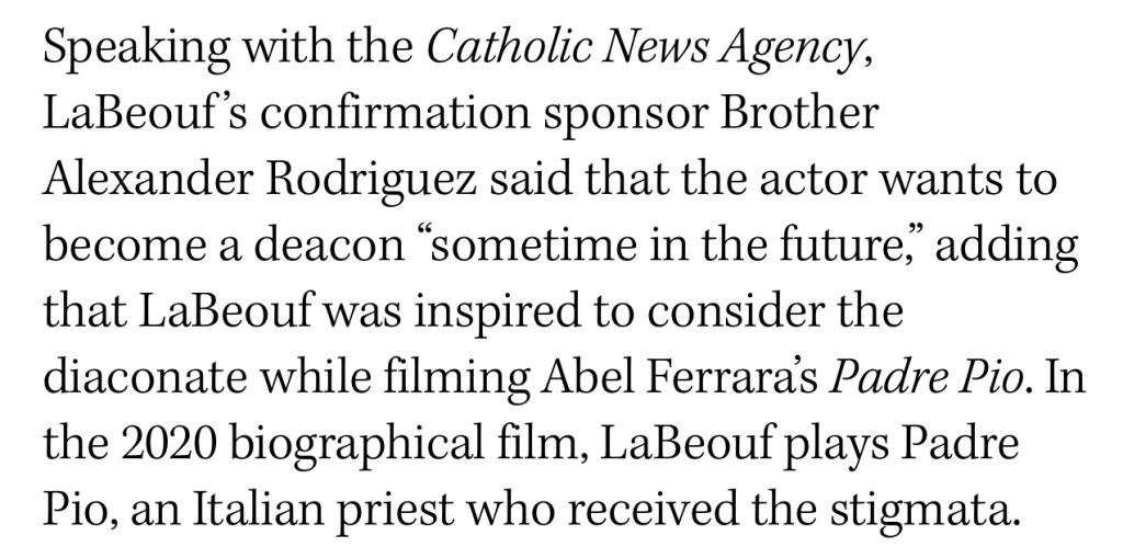 Wanting to become a Catholic deacon is “better” than wanting to become a heroin addict or an Islamic terrorist, but in the realm of ShiaLeBeouf it’s the same basic dynamic — an inability to trust his own mystical realm and an urge to submit to a stronger external current.