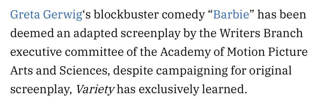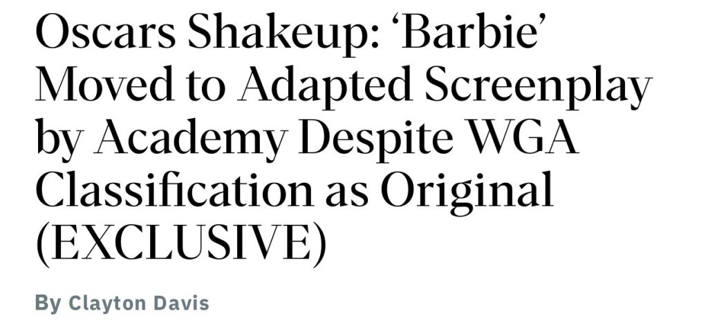 Yesterday afternoon Variety’s Clayton Davisreported that AMPAS has officially classified Greta Gerwig and Noah Baumbach’s Barbie script as adapted and not original.