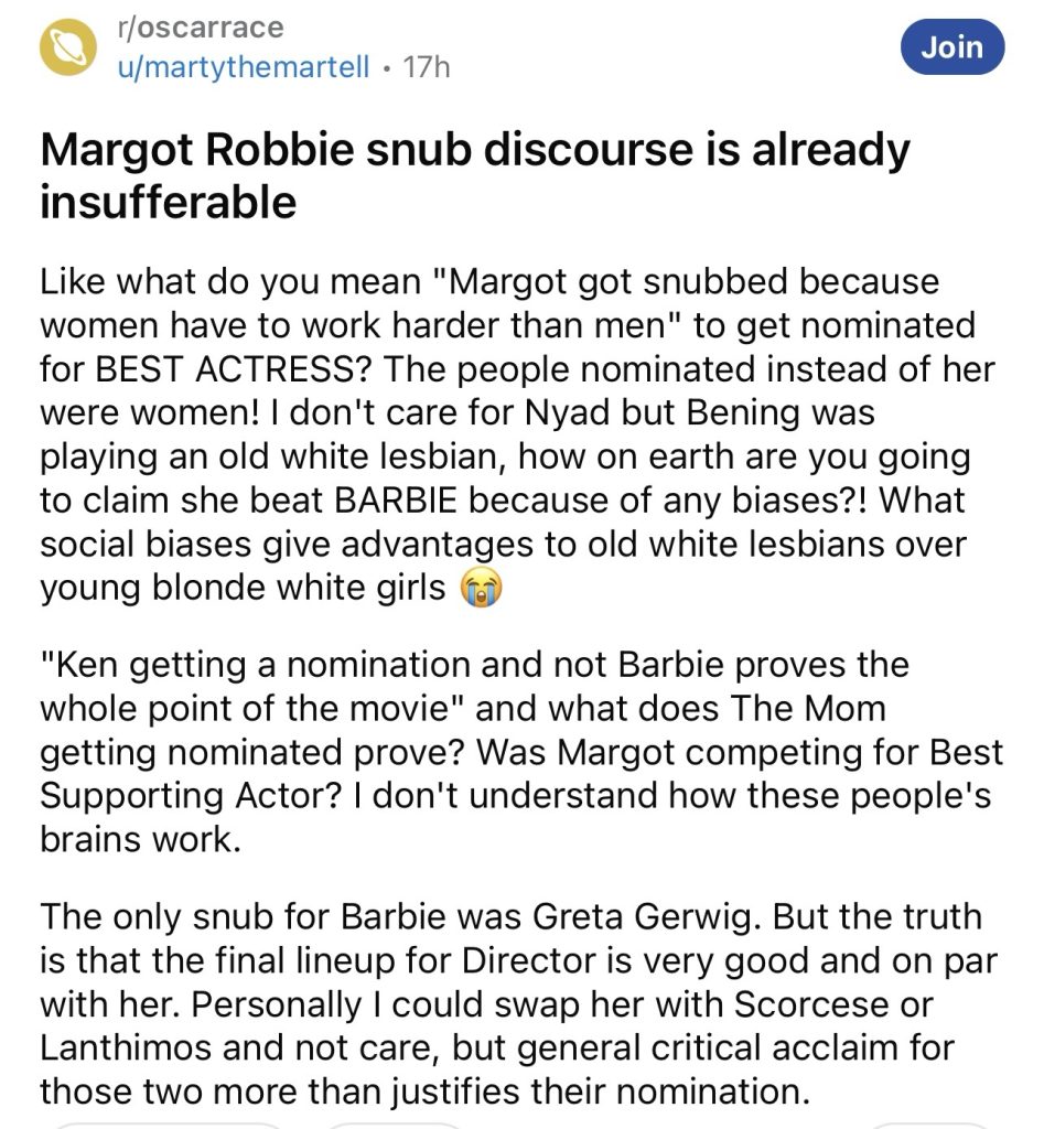 Unless the Academy’s mostly male director’s branch had a bug up their ass about Barbie’s misandrist satire…who knows? There’s no question that Barbie pretty much despises the XY community or at least regards them with a measure of contempt or pity…c’mon.
