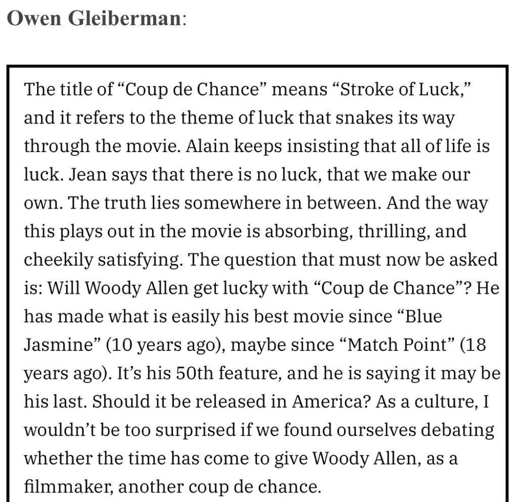 I personally regard Coup de Chance as a very valuable viewing opportunity. I’ve spent several months begging to see it.