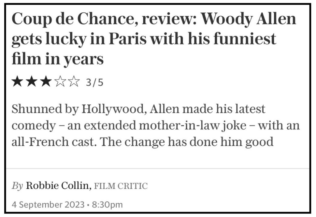 A 4K Italian Bluray of Woody Allen’s Coup de Chance will be released on 3.18.24 — roughly two months hence. Which means that the pirates will soon after be streaming it, which of course will lower whatever value it has stateside.
