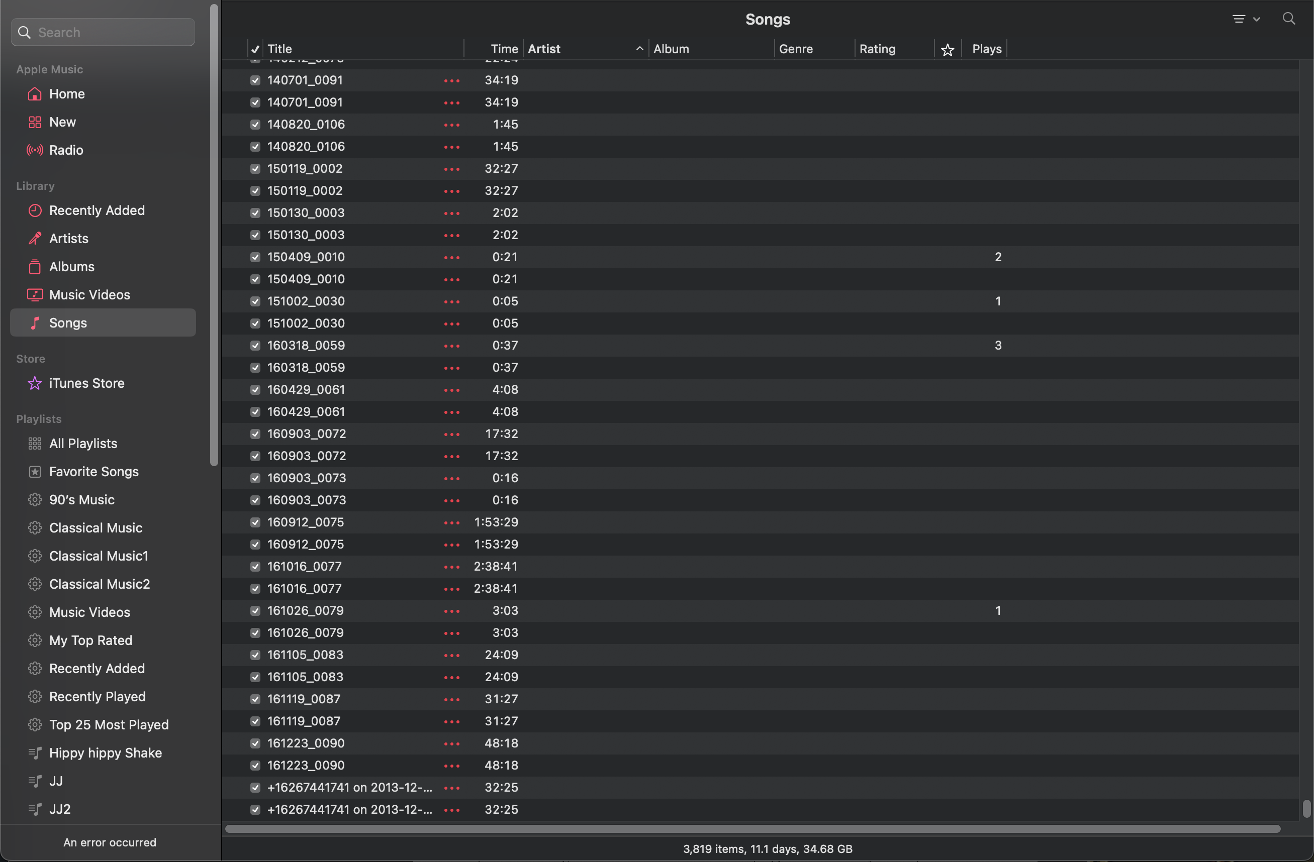 Anyway, I deleted the mp3s and realized the next morning that all the music was indeed absent from my Apple music library. Just under 4000 songs, roughly 1200 album portions. Plus there was a ton of music library stuff from burned CDs and old Napster files from…Jesus, a quarter-century ago.
