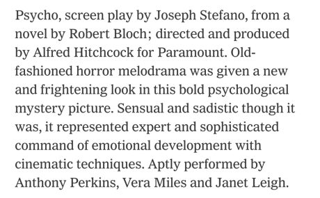 Bosley Crowther’s reaction to Alfred Hitchcock’s Psycho in his 6.16.60 N.Y. Times review is mostly one of distaste for the grisly stuff, which he regards as low-rent. He then masks his snooty prejudice by feigning boredom.