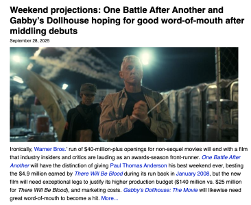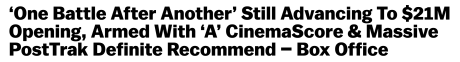 The radical political stuff is presumably playing well in the costal blue cities. That plus the “okay, Paul Thomas Anderson, a brand, has earned my ticket-buying allegiance” crowd.