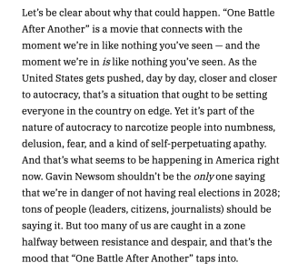 “As the United States gets pushed, day by day, closer and closer to autocracy, that’s a situation that ought to be setting everyone in the country on edge. Yet it’s part of the nature of autocracy to narcotize people into numbness, delusion, fear, and a kind of self-perpetuating apathy. And that’s what seems to be happening in America right now. Gavin Newsom shouldn’t be the only one saying that we’re in danger of not having real elections in 2028; tons of people (leaders, citizens, journalists) should be saying it. But too many of us are caught in a zone halfway between resistance and despair, and that’s the mood that One Battle After Another taps into.”