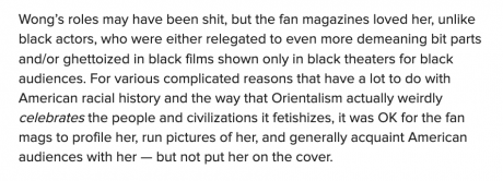 I won’t see Babylon until tomorrow night, but please read a 9.30.14 Buzzfeed piece about Wong, written by Anne Helen Petersen and titled “The Forgotten Story Of Classic Hollywood’s First Asian-American Star.”