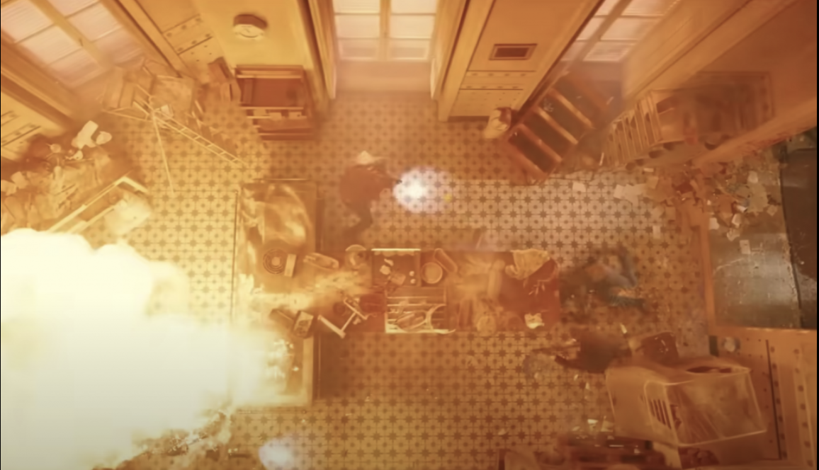 Reeves going from room to room and blasting bad guys at every turn with the camera constantly maintaining its God’s-eye viewpoint.