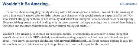 Mutaman wrote that prior to 2010 ‘there were like a zillion movies like this and they all sucked.’ Right. The Graduate, Rushmore, Bottle Rocket, American Graffiti, Loving, I Love My Wife, Ordinary People, Risky Business, Falling Down, Blue Collar, Ghost World, Hardcore, Breaking Away, The Stepdad, Match Point, Parenthood, Juno, The Kids Are All Right, The Talented Mr. Ripley, Little Miss Sunshine, The Squid and the Whale, Heathers, Dead Poet’s Society, Up In The Air, Clueless, Dazed and Confused, A League of Their Own, Falling in Love, Kramer vs. Kramer, The Verdict, Slapshot, Manchester By The Sea, Boyhood, Thirteen, This Boy’s Life, Superbad, Napoleon Dynamite, Almost Famous, Rebel Without A Cause, The Man in the Gray Flannel Suit, No Down Payment, Hud, Fast Times at Ridgemont High, Field of Dreams…none woked-up, all sucked ass.