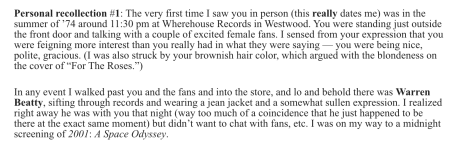 “And if you listen to the song, and think about what the power of a song would have been over the last scene, it’s not about the proverbial bumbling guy [whom Beatty was playing in Shampoo and whom he seemed to be actuality, socially and sexually and whatnot, back then]. The movie would have conveyed that this was a persona, under which was incredible insecurity and doubt, but Beatty was like ‘no, no…don’t need that song in the movie.’ I’d rather have Simon’s ‘doo-dee-dooooo.'”