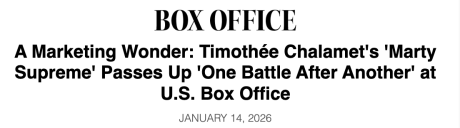 A 1.14.26 Pamela McLintock THR story says that Marty Supremeola has earned more domestic coin than One Battle After Another.