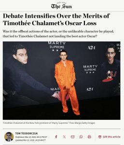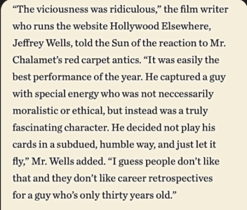 The internet’s psychotic thrashing of Timothee Chalamet in the wake of his losing the Best Actor Oscar…the binge lasted five days and is finally done. (I think.) But one last article in this vein appeared yesterday in the right-leaning New York Sun — not another witch-burning piece but a calm and rational assessment of why it happened.
