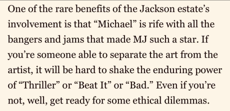 Like you, I love the current and the spunk and the edgy technique that Jackson used to create those songs and bust out those brilliant dance moves. I can compartmentalize. I can put the child molesting in a steel suitcase and leave it in the trunk of the car while watching Michael in a theatre.