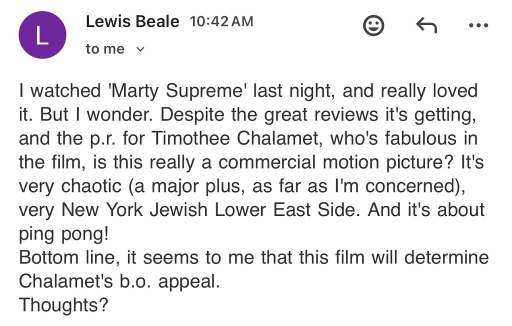 HE to McCuddy: Have you seen Marty Supreme? It’s the bolt and the buzz and the sheer fuckoff-edness, but Chalamet is not channelling Don Logan….he’s not playing a malicious psychopath but a pushy, charming pogo stick…a user, taker, grifter and tap-dancer. (Who plays a great game of ping-pong.) He’s a crazy artist, an obsessive believer, a go-go guy on the make.