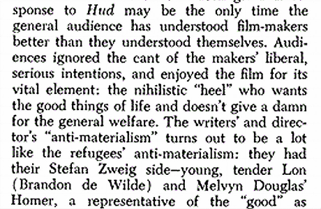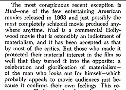 And it was Pauline Kael who first spptted what had happened, and laid it all out in a 1964 Film Quarterly piece called “Hud, Deep In the Heart of Divided Hollywood.”