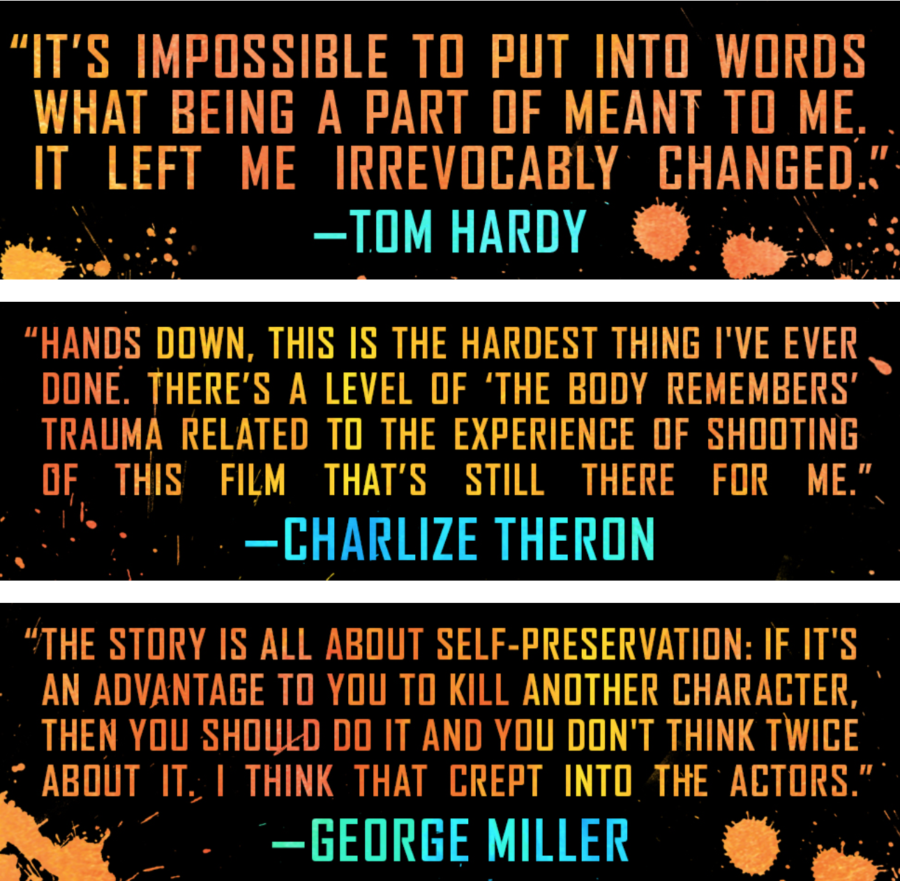 From Kyle Buchanan‘s “Blood, Sweat and Chrome: The Wild and True Story of Mad Max: Fury Road“, which is basically strung-together quotes from everyone who was there during the making of arguably the greatest action film of all time.