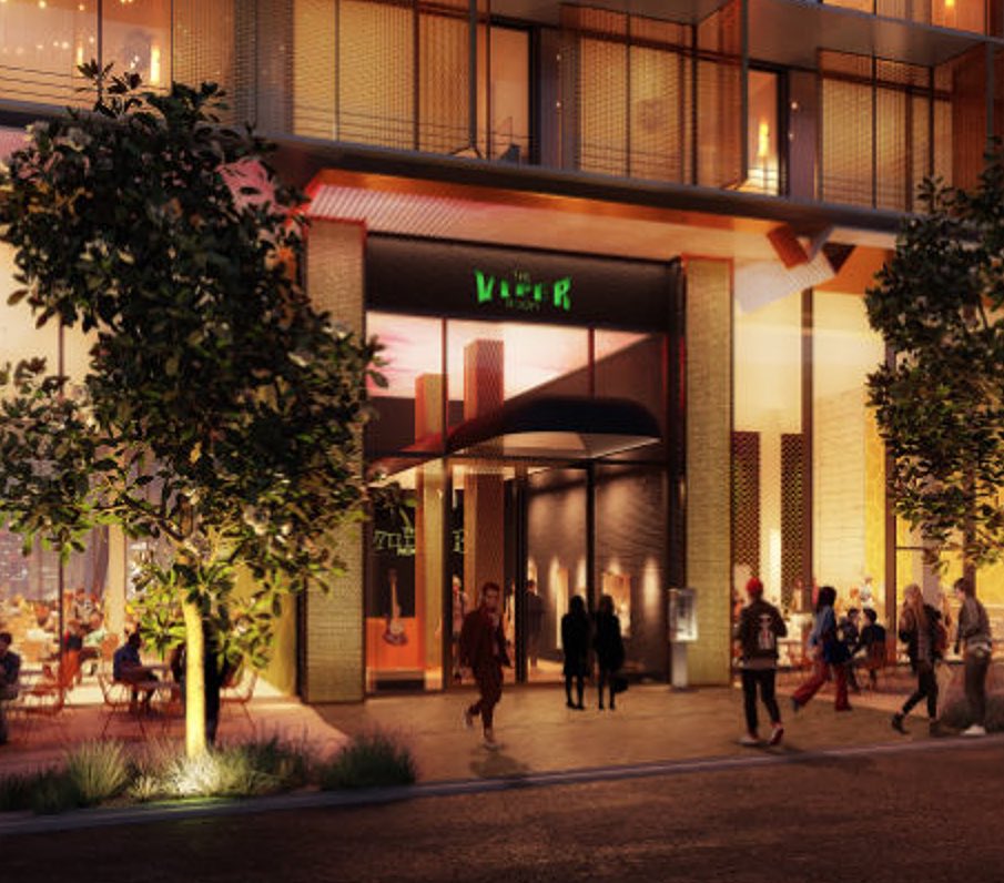 No, they’re not destroying the Viper Room…well, they are but they’re re-launching or reconstituting it as a kind of corporate lounge rock-music club, or so it seems. The VR’s glowing shamrock green color (a trademark thing) will frame the entrance.