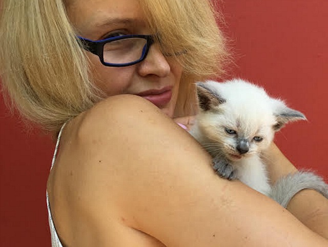 To me, the heartache of Aura’s sudden passing meant getting another kitten right away. I’ll never stop feeling sad about Aura’s cruel fate (she died after only eight years and a couple of weeks) but you have to get back on the horse. This morning I bought a five-week-old bluepoint Siamese kitten, whom we quickly named Anya. She’s a baby — being fed special young-kitten formula out of a bottle, crying a lot, likes to be constantly held or to sit next to a warm human body. But she’s smart and spirited and very emotionally responsive, like all Siamese. Yes, I know that kittens should stay with their mom until eight or ten weeks of age, but the guy was selling and she only cost $250 so I wasn’t about to school him or look a gift-horse in the mouth.