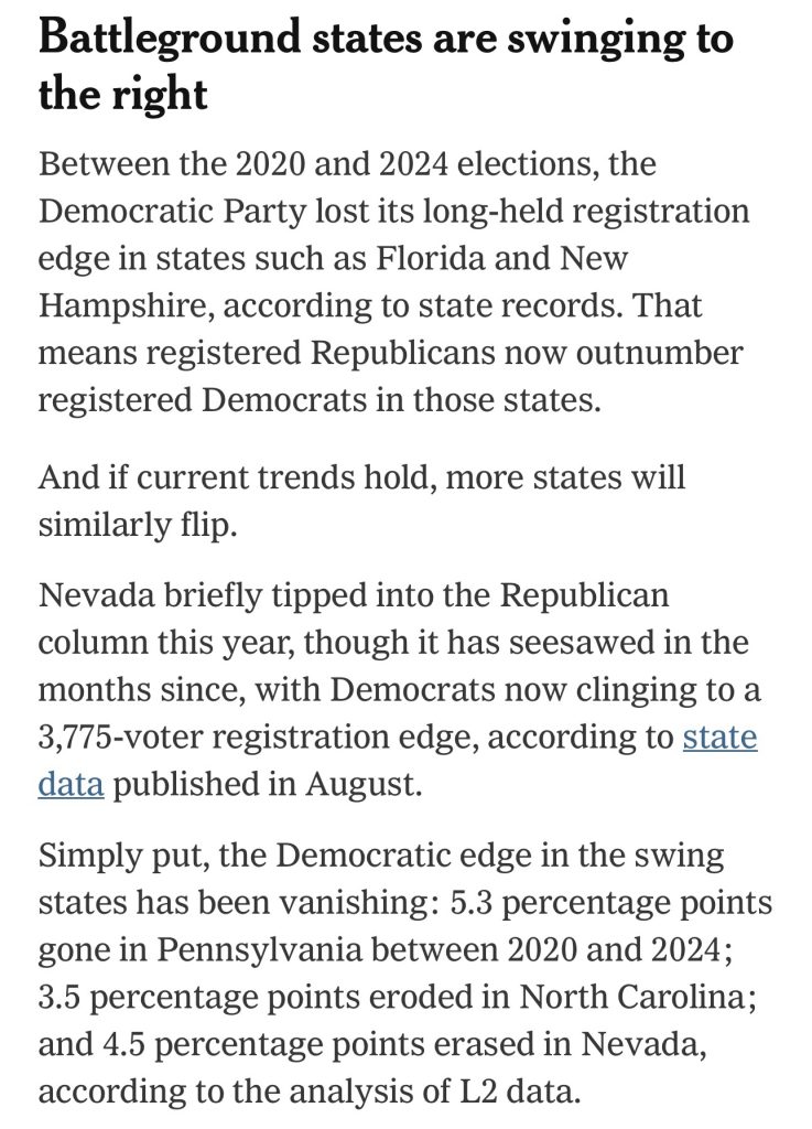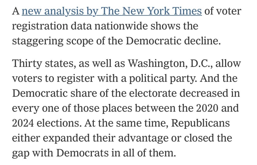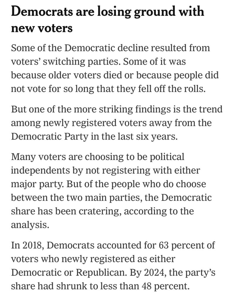 Over-the-cliff woke shit has all but destroyed the Democratic brand among a plurality of voters, as a newN.Y.Timesvoterregistrationsurvey implies. The Democrat registration fall-off is “staggering,” according to Times reporter ShaneGoldmacher.