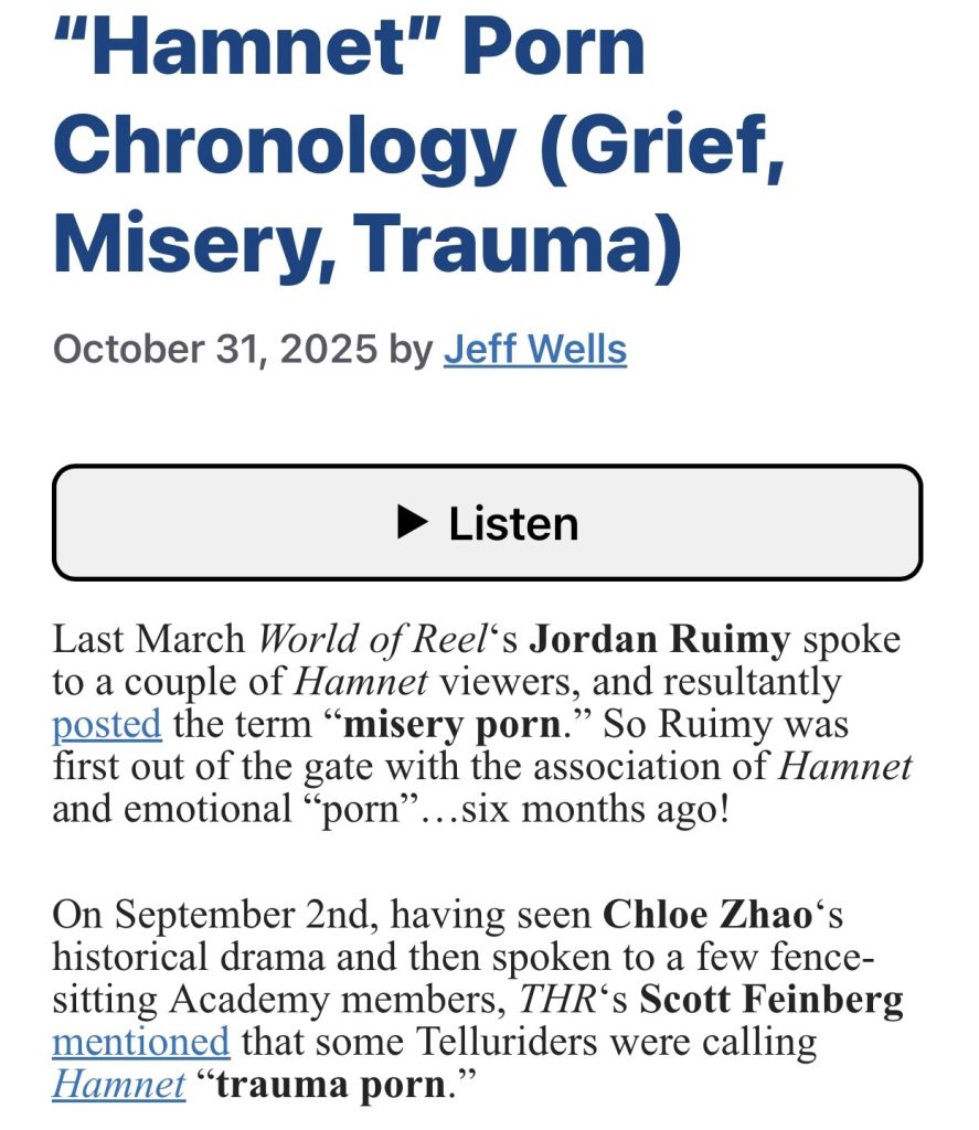Tomorrow afternoon’s screening is important. The fate and the tilt of the 2025/‘26 Best Picture Oscar race will be affected one way or the other. On the face of it I’m more into the hypothetical fantasy of Hamnet beating the agitproppy One Battle After Another than vice versa.
